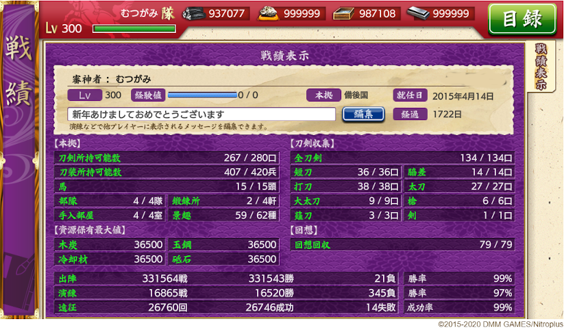 次からは通常のレベル上げ編成。薬研out毛利97in、残りは同じ。
