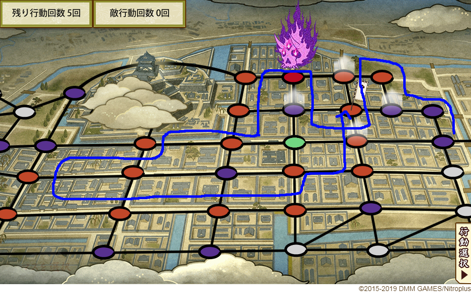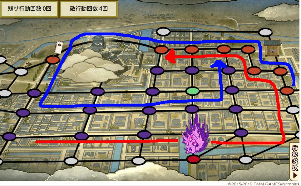 だいたい城裏手を抜けたあたりでボスは右に移動し始める。そこから2マス降りて、最下段を左に逆走しないよう圧をかけるのが重要。一度ケチって一歩手前で曲がったら上手くいかなかった。……まあそれもボスが早めに右に移動してたら問題ないのかもしれんが。